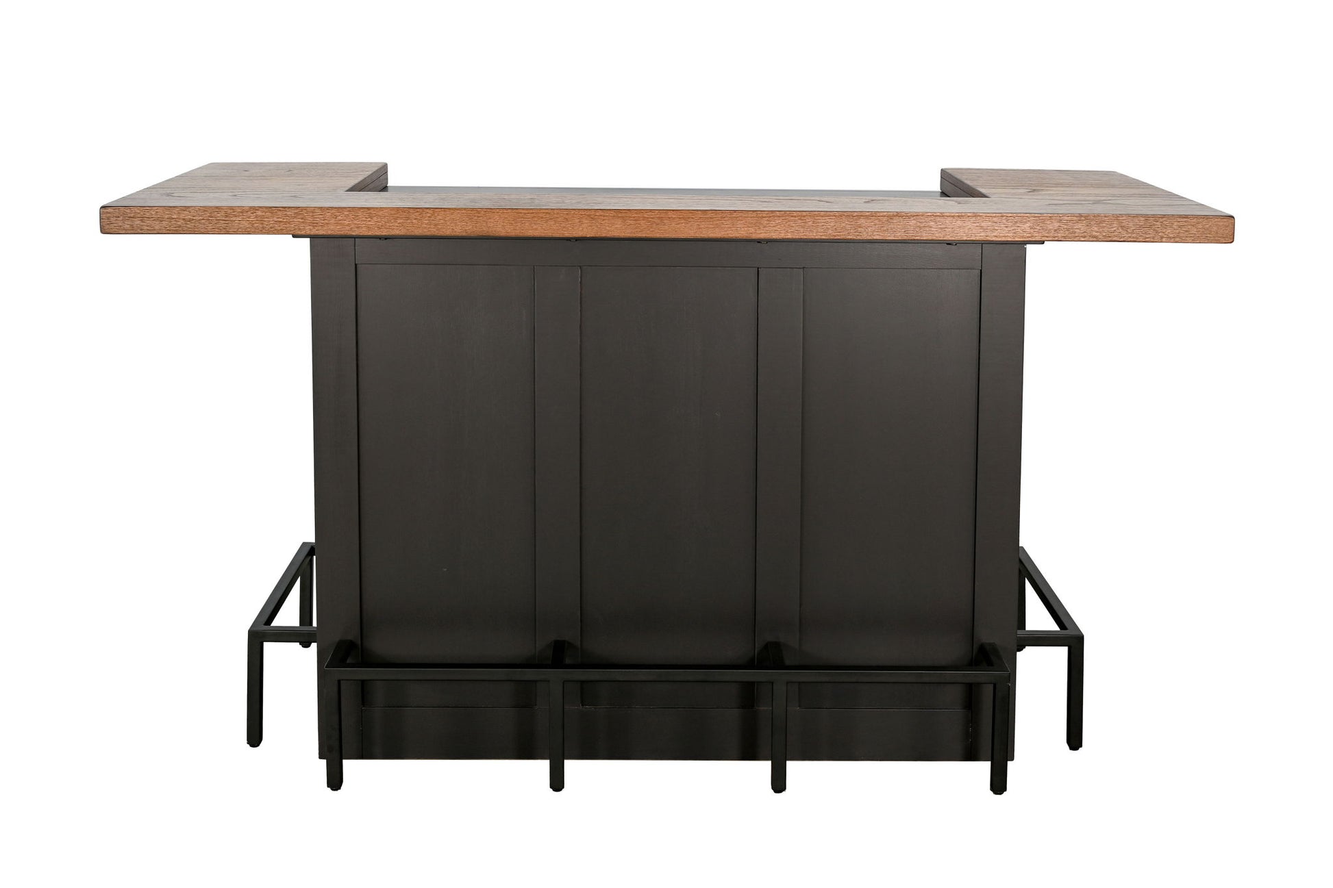 Bring the bar experience home with this industrial U-shaped bar counter. Designed for entertaining, it features a raised wood bar top, sleek black frame, and ample storage below. Two drawers, four open shelves, and an integrated stemware rack provide space for everything from cocktail tools to glassware. A built-in metal foot rail completes the look while adding comfort for guests. Perfect for basements, game rooms, or stylish dining spaces.