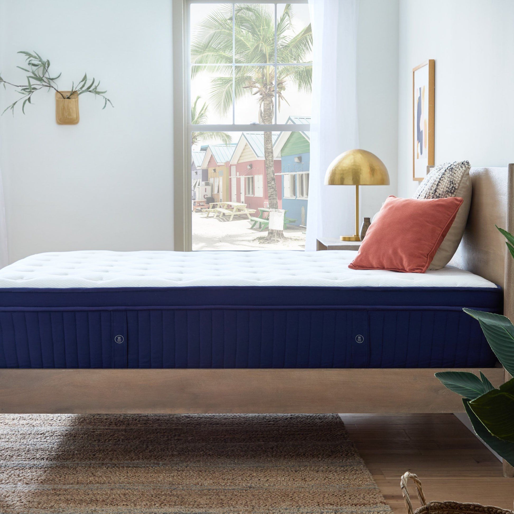 With the new Weekender™ Euro Top Hybrid Mattresses, you can sleep like you’re on vacation. This new take on a more traditional look features a tufted euro top design with channeled sidewalls in a rich blue. This 13-inch construction features layers of convoluted memory foam to increase airflow and cradle pressure points, deep high-density foam for even weight distribution, and steel pocket springs for durable support. The layer of coils has thicker-gauge coils on the perimeter for long-lasting edge support. Designed with a medium-plush feel, this hybrid mattress will appeal to all sleep styles and is great for primary suites, guest bedrooms, and more. It comes conveniently rolled and compressed for easy transportation and is backed by a 10-year warranty.