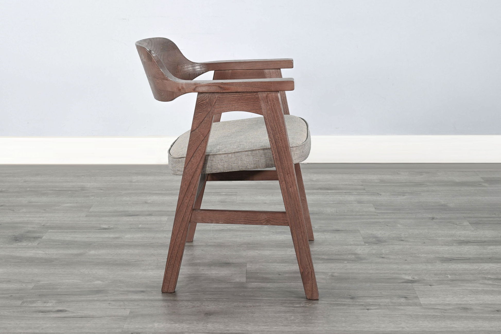 A sleek fusion of form and function, this solid wood arm chair brings mid-century modern charm to any dining or accent space. The sculpted frame and low-profile arms offer a refined silhouette, while the padded seat cushion provides everyday comfort. Crafted from solid wood with visible grain detailing, this piece is perfect for dining tables, office nooks, or lounge corners.